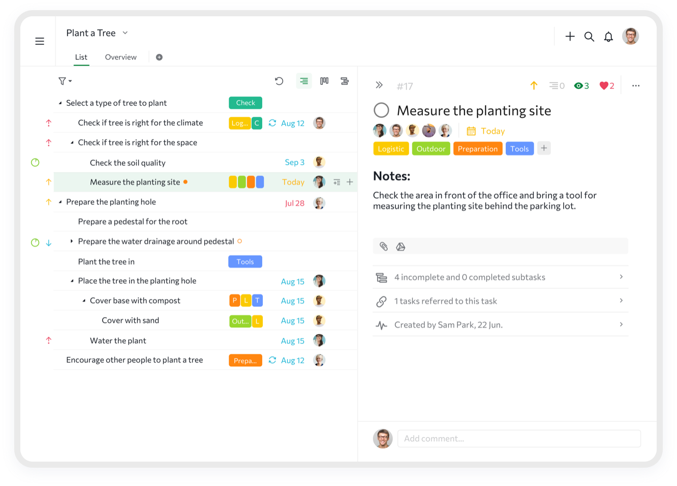 한눈에 들어오는 하위 목록 뷰를 활용해 효과적으로 작업하세요. 모든 팀원이 한눈에 집중할 수 있는 목록 뷰를 통해 자신의 업무를 확실히 관리할 수 있습니다.
